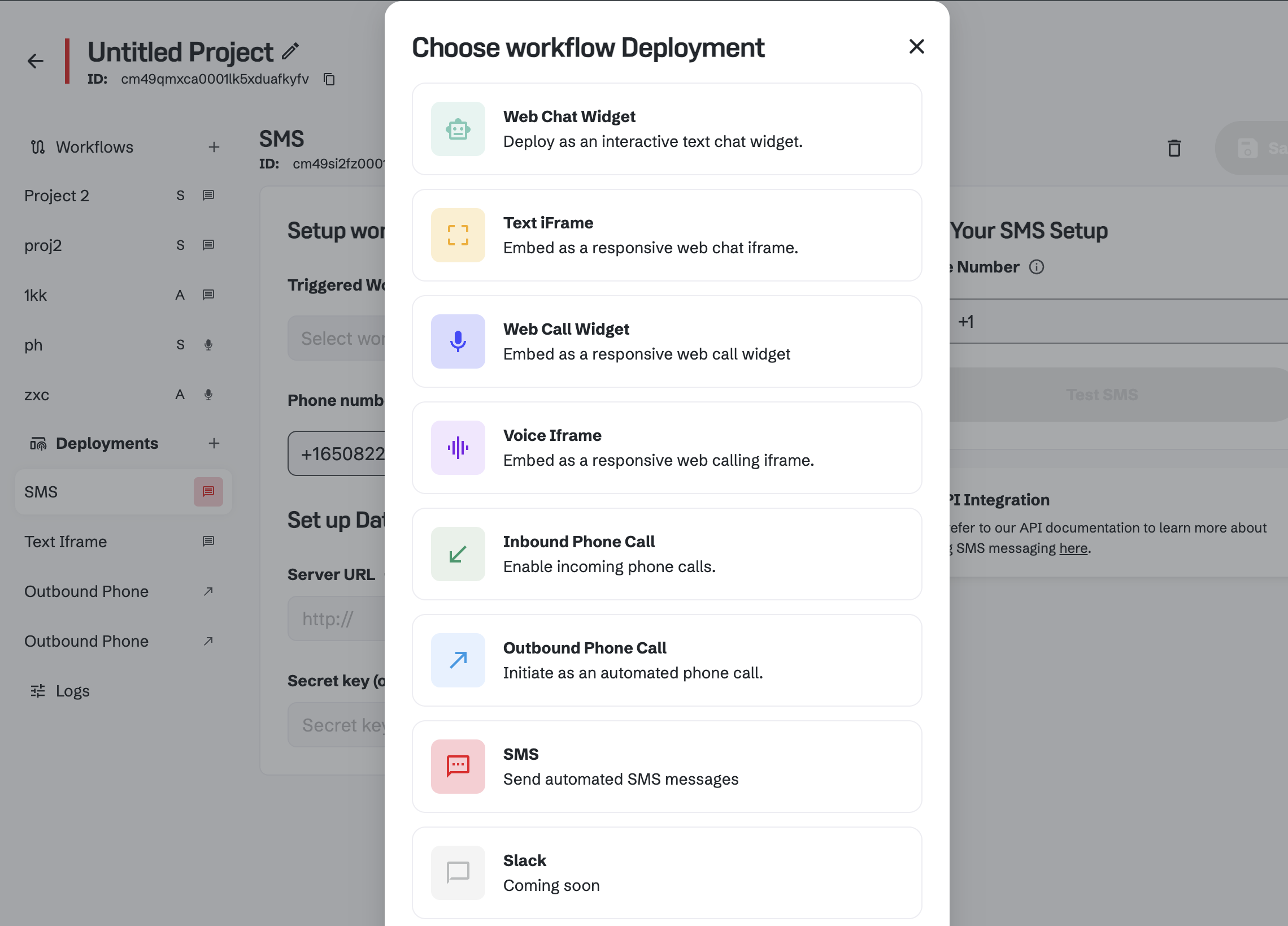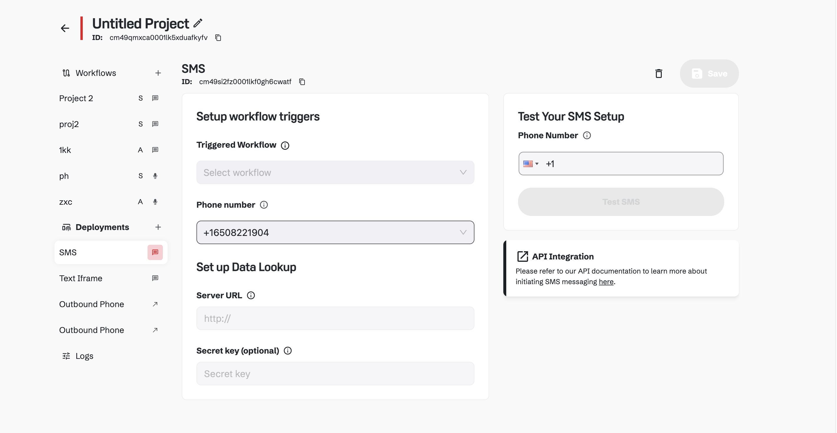You can test your SMS deployment by adding any number and clicking on theTest SMS button in the sidebar. As a result - you will receive a test SMS on the given number. You can also respond to the SMS and chat with your AI, which you should set up in the connected Workflow.